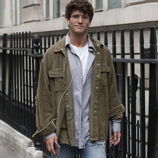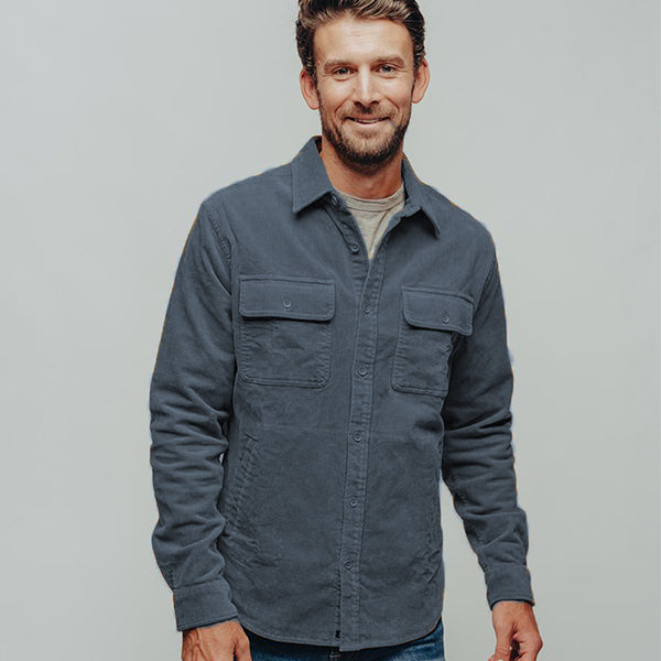 ++ Corduroy is a strong durable fabric with a rounded cord, rib, or wale surface formed by cut pile yarn. The back of the goods has a twill weave. We used a cotton with added stretch fabric for its comfort and recoverability. This shacket has all the right details for a staple piece.